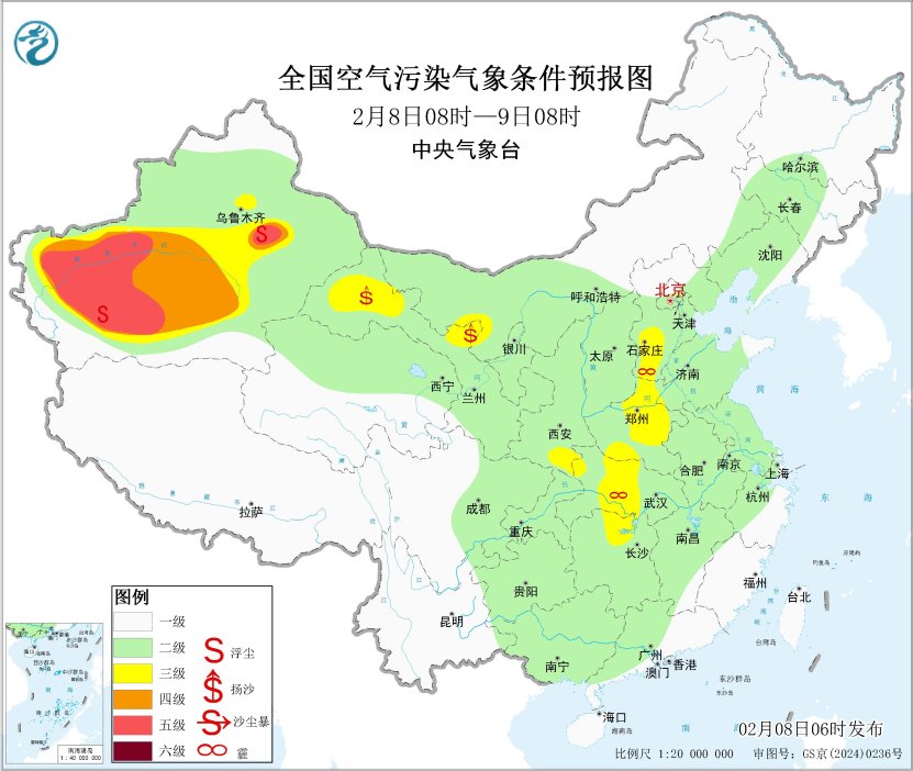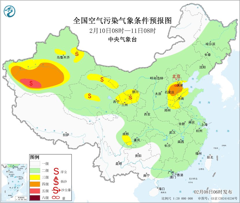 8日至9日,华北中南部、黄淮等地大气扩散条件一般,有轻度霾,部分地区有中度霾。10日受弱冷空气影响,华北中部、黄淮西部大气扩散条件有所改善。此外,9日,内蒙古西部、甘肃中西部、青海等地有扬沙或浮尘天气。