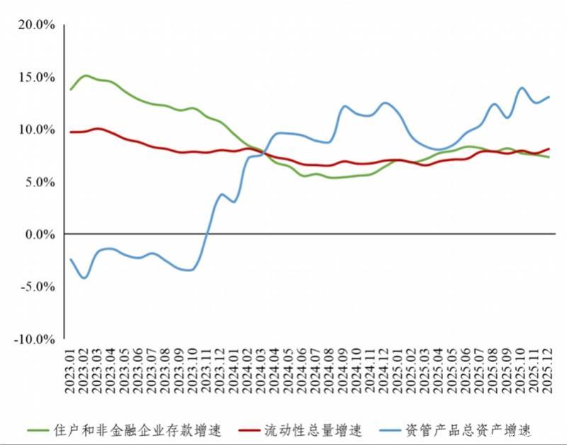 央行解释,如果存款转化为资管产品,这些产品若投向同业存款和存单,会直接增加非银机构在银行的存款;若投向其他底层资产,最终也会通过企业或相关机构回流至银行体系。因此,从资金归宿看,存款向资管产品转移更多是改变了银行存款结构——住户和企业存款占比有所下降,同业存款占比上升,但两者合并后的增速与广义货币M2增长基本接近。